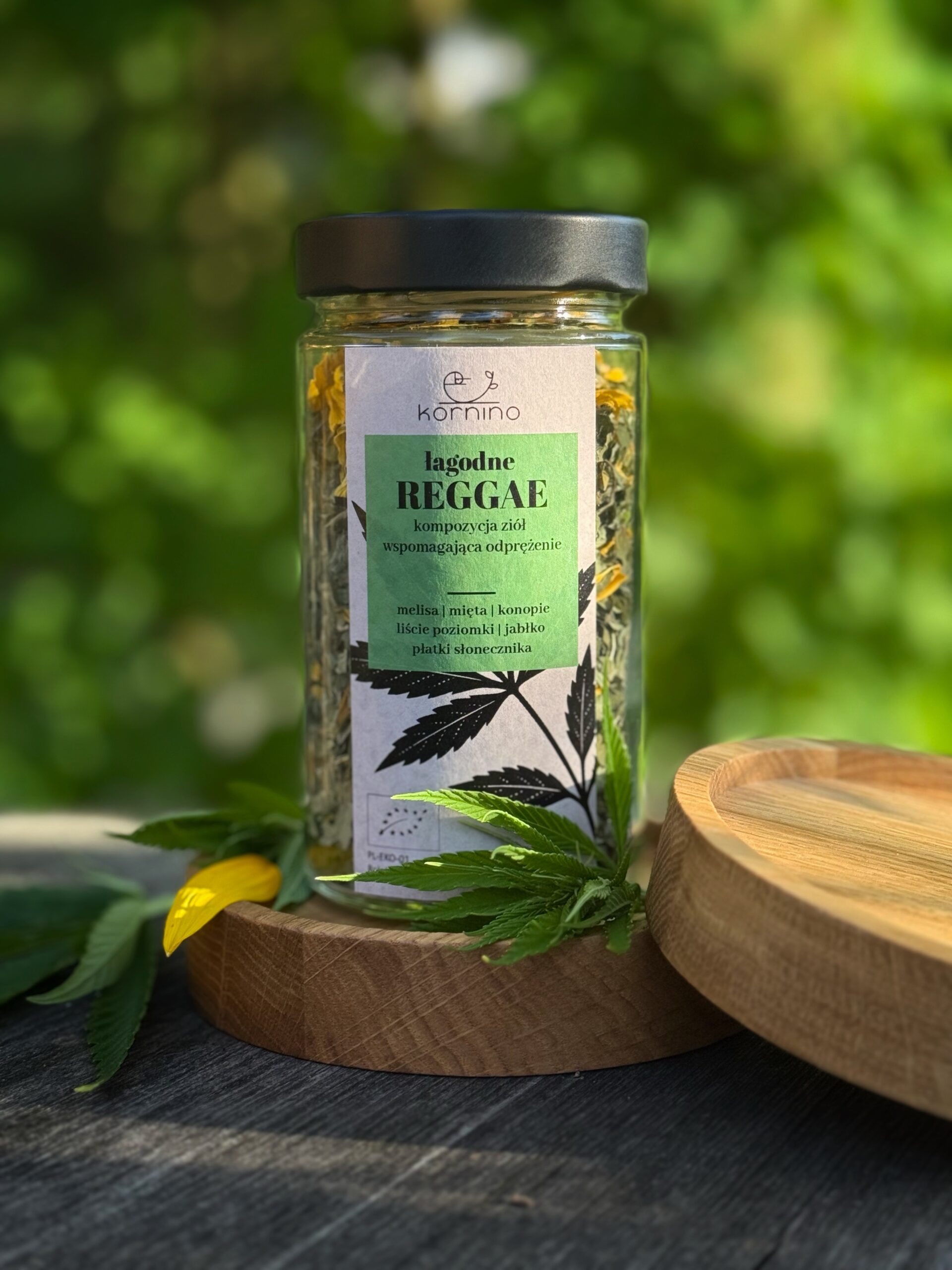 Łagodne Reggae to ziołowa kompozycja, która płynie spokojnym rytmem ukojenia. Stworzona z ekologicznych ziół uprawianych w gospodarstwie Kornino, położonym tuż przy Puszczy Białowieskiej, a skomponowana przez Płonke Podleśną, która po mistrzowsku połączyła rośliny o działaniu relaksującym i łagodzącym napięcia.
