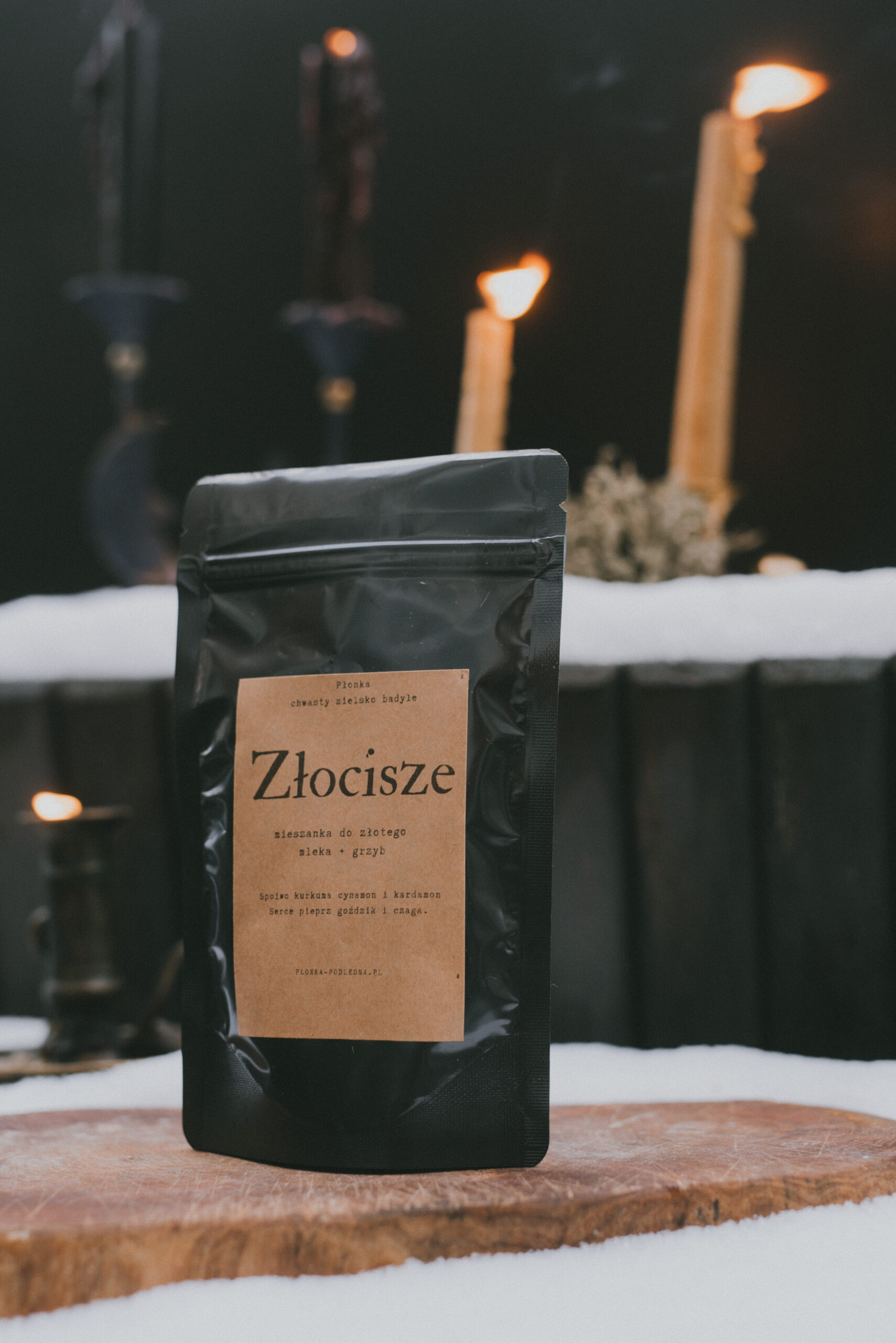 Mieszadełko złotych przypraw w połączeniu z grzybową królową Czagą (błyskoporek podkorowy, znany również pod nazwą włóknouszka ukośnego) do uiszczenia w mleku roślinnym z łychą dobrego miodu.