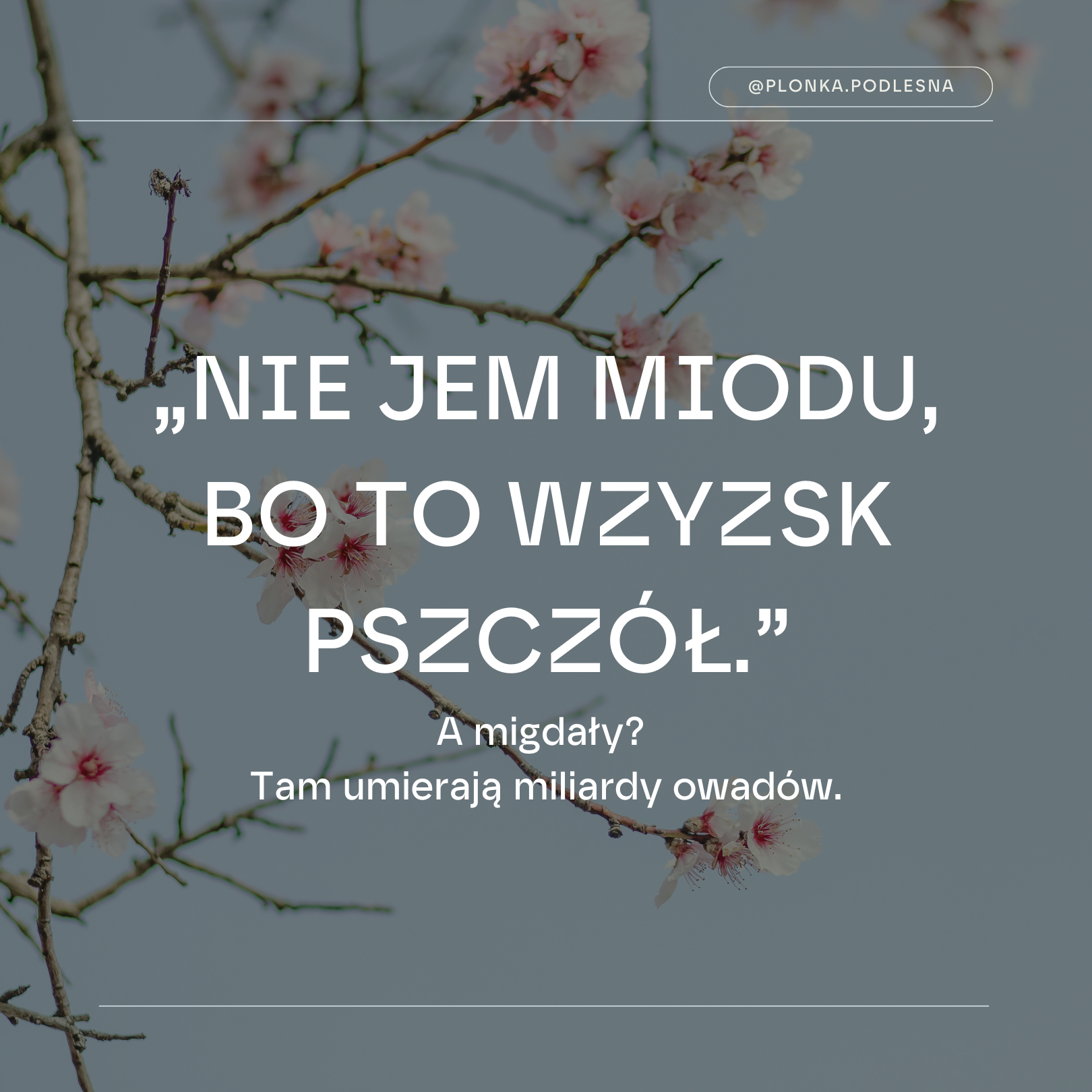 A migdały? Nie jem miodu, bo to wyzysk pszczół.” Ale migdały z przemysłowych plantacji — gdzie co roku umierają miliony zapylaczy są OK? W tej karuzeli pokazuję, dlaczego miód z pasieki często bywa…