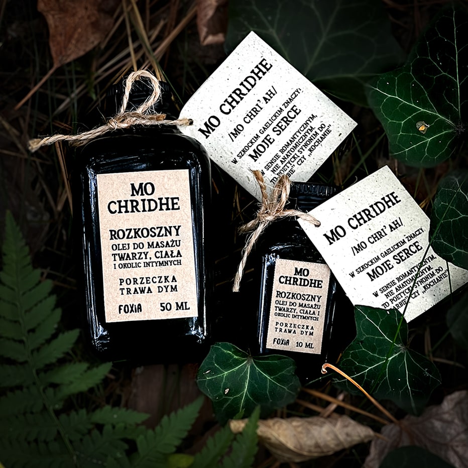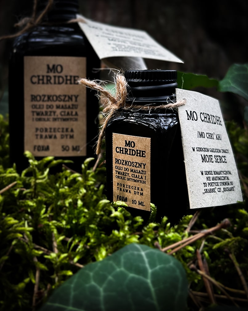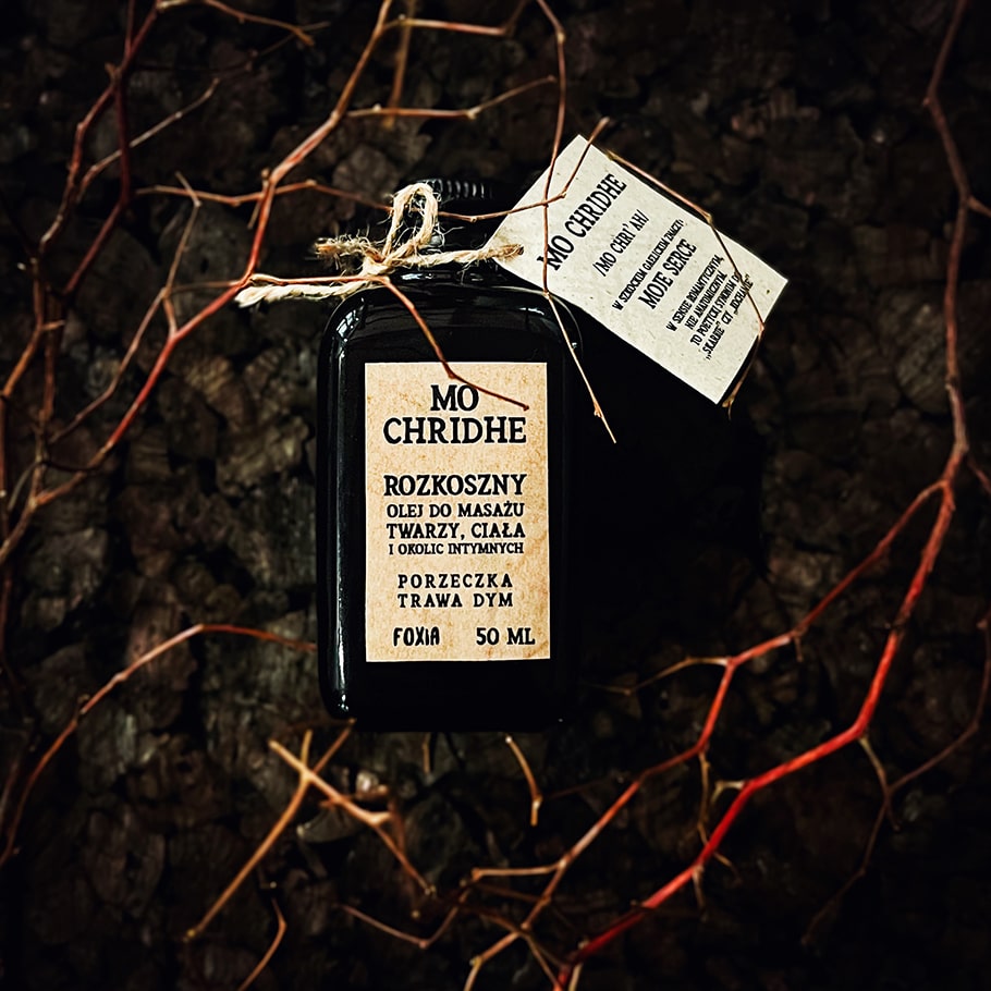 Mo Chridhe to wyjątkowy olejek do masażu intymnego oraz do masażu całego ciała i twarzy. Olejek o zapachu pączków porzeczki, trawy, wanilii i dymu. Soczysty, głęboki i zmysłowy do granic możliwości. To zapach miłości w zamkowych zakamarkach, takiej trochę zakazanej, w ukryciu, wśród łanów traw.