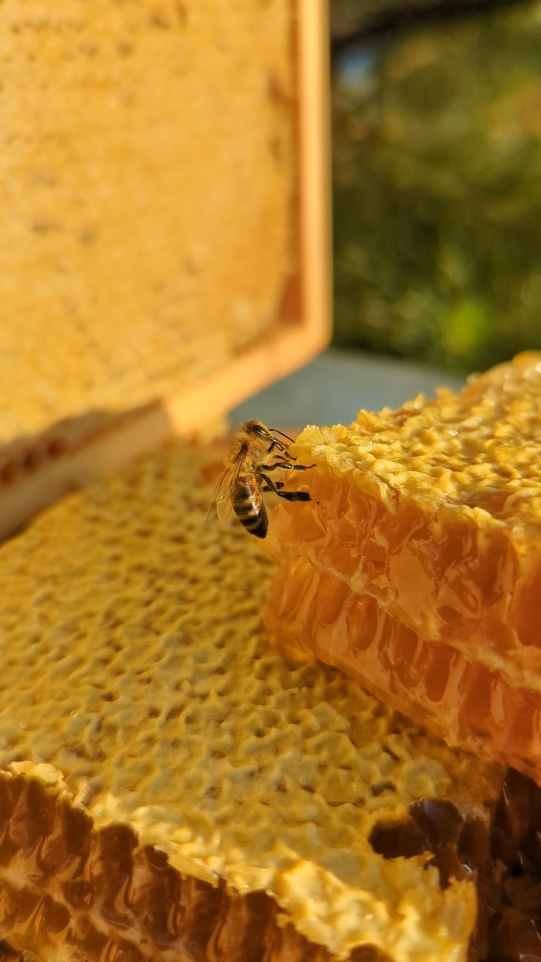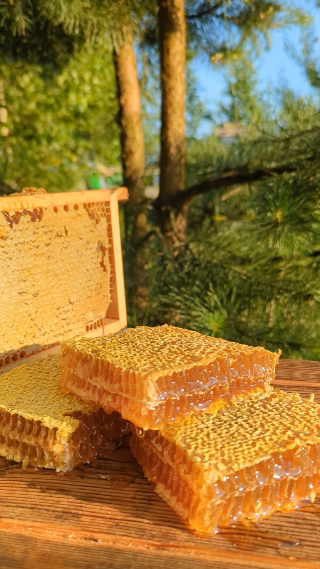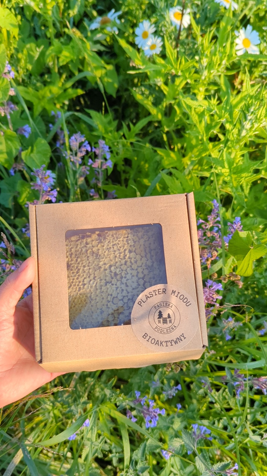 - Naturalna forma: miód pozostaje w naturalnych plastrach, co oznacza, że nie jest poddawany procesom filtracji ani obróbce termicznej. Plastry zawierają zarówno miód, jak i wosk, które mogą być spożywane razem.