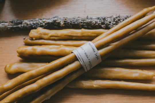 Moje woskówki lejne powstają z warmińskiego wosku pszczelego z naszej pasieki, zebranego przy letnim miodobraniu. Wosk jest przetopiony w złote krążki i lekko oczyszczony, aby została w nim cała dusza ula: propolis, miód, pierzga, pyłek i oddech naszych podopiecznych.